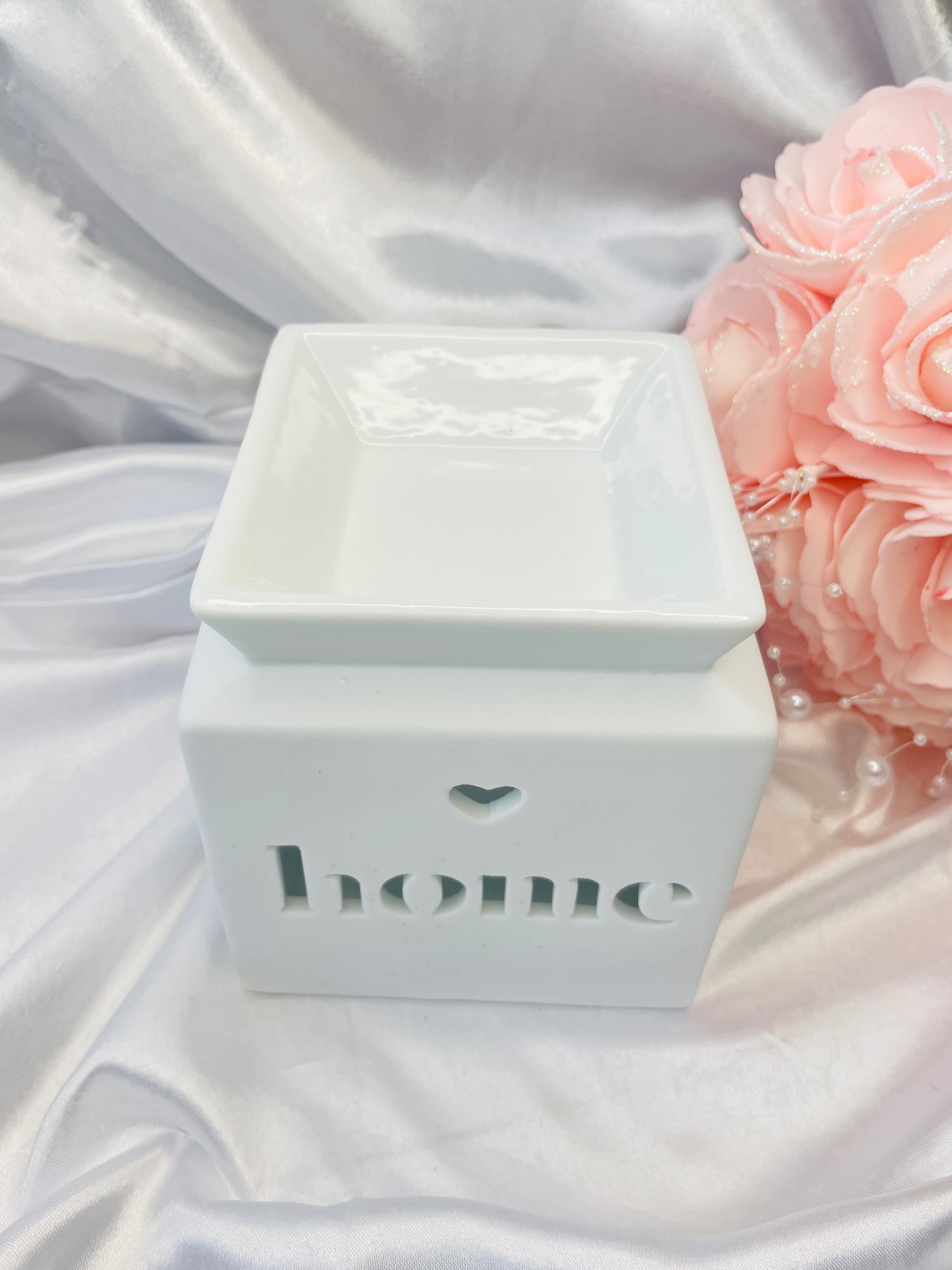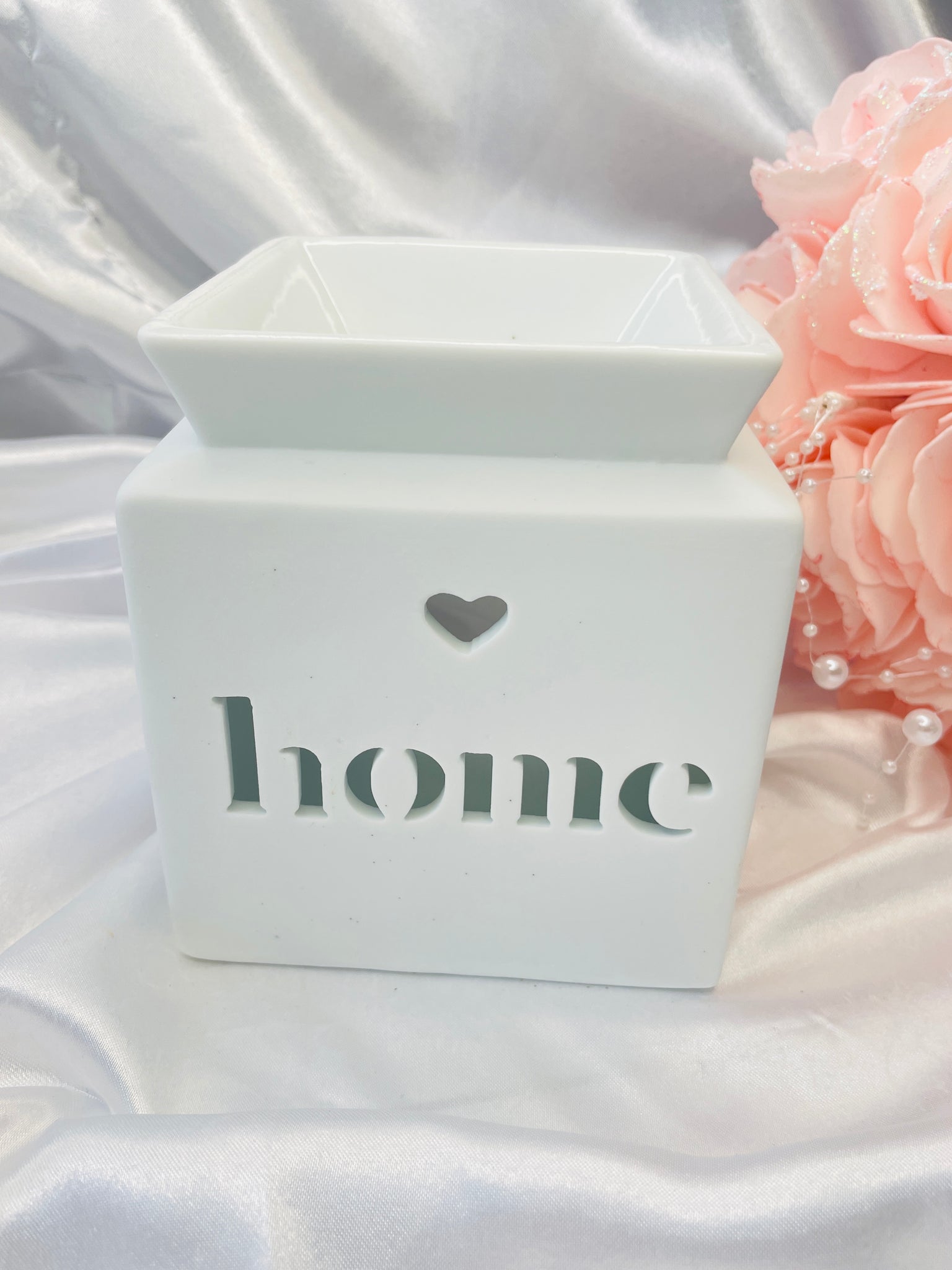 Square Ceramic Burner With Home Text Cut Out Design With a Little Cut Out Heart Above The Text. White. Deep large dish, perfect for larger melts.