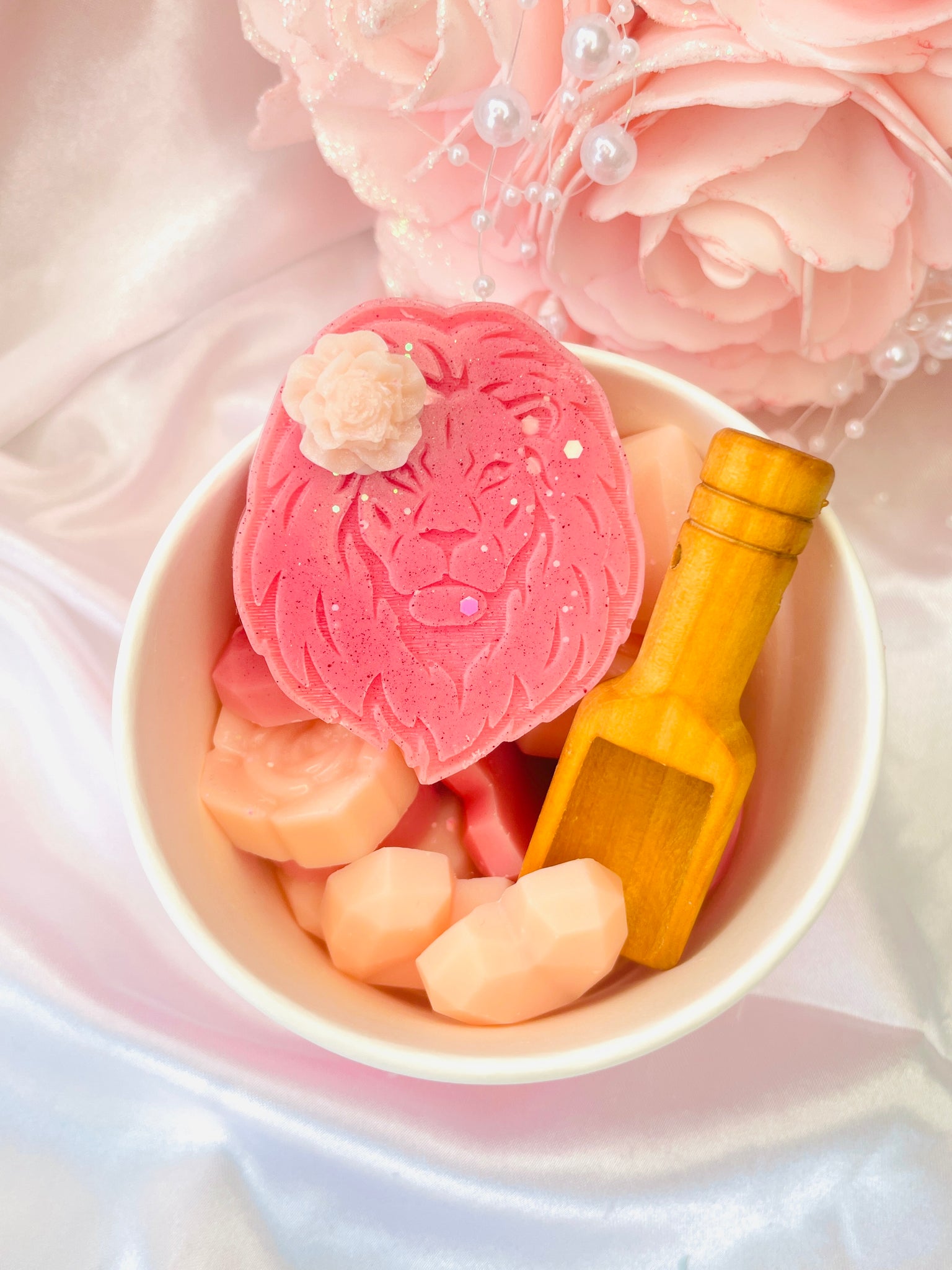 Our  Signature Lion & Rose pretty scoopie pots contain 120g of wax in a variety of rose & heart shapes & our signature Lion melt! Perfect for scooping into your burner. Spoon included.
