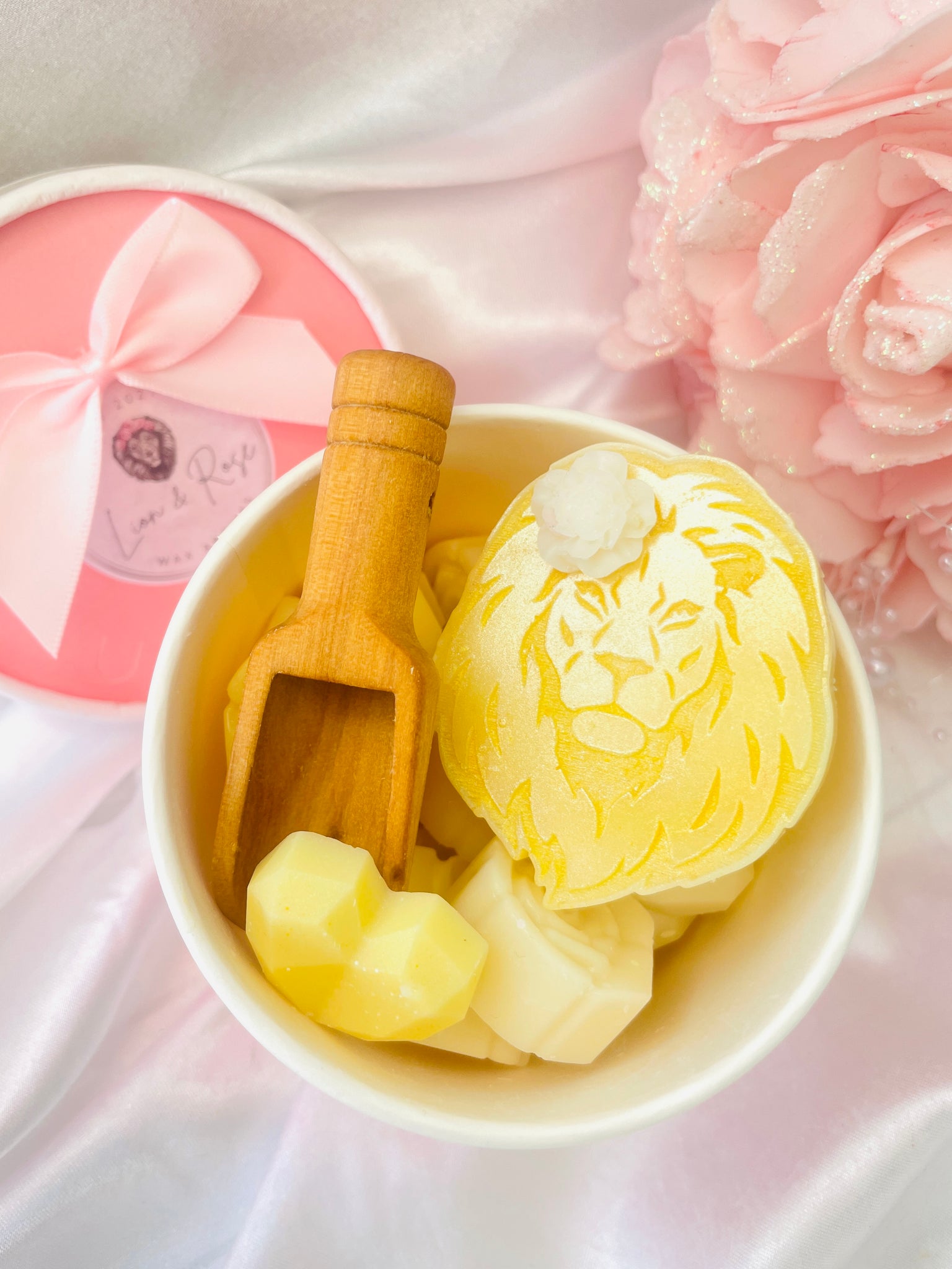Our  Signature Lion & Rose pretty scoopie pots contain 120g of wax in a variety of rose & heart shapes & our signature Lion melt! Perfect for scooping into your burner. Spoon included.