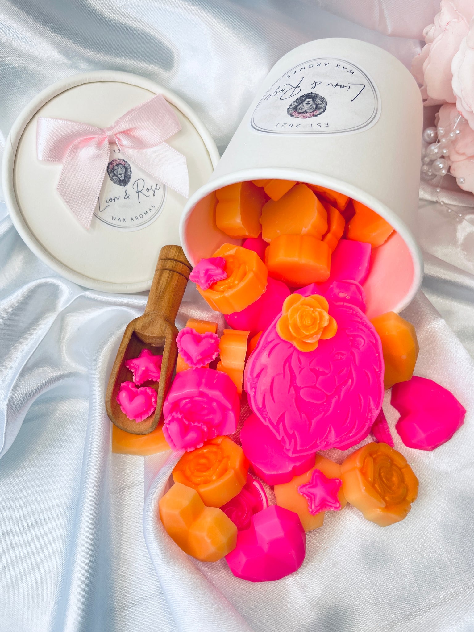 Our Signature Lion & Rose pretty scoopie pots contain 120g of wax in a variety of rose & heart shapes & our signature Lion melt! Perfect for scooping into your burner. Spoon included.